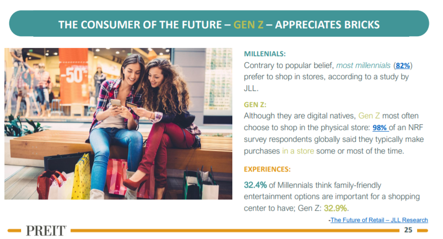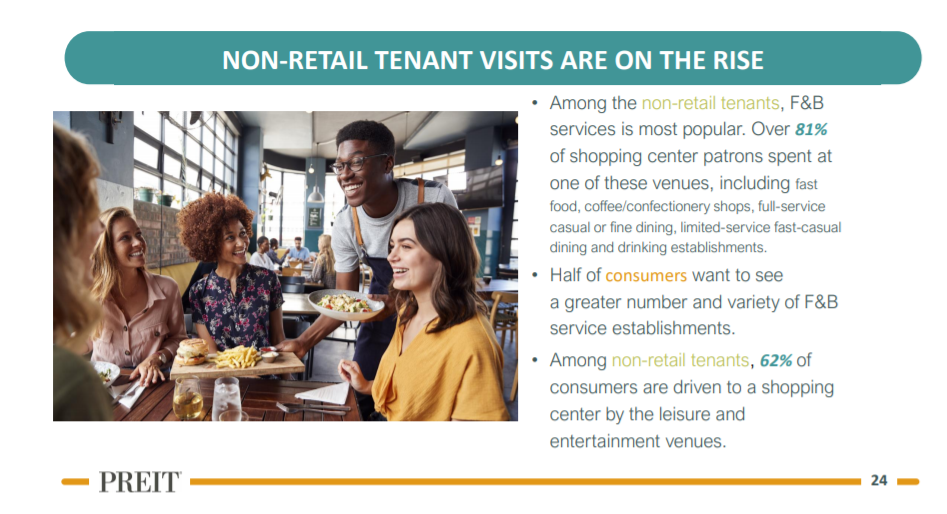 펜실베니아 리얼이스테이트(PREIT, PEI)는 미국 남동부, 펜실베니아주를 중심으로 쇼핑몰을 운용하는 리츠로 약 20여개의 쇼핑몰을 보유하고 있다. 쇼핑몰은 지고 있는 산업이라고 불린다. 다만 국내 트렌드에서도 볼 수 있듯이, 이러한 쇼핑몰은 스타필드와 같이 놀이공간, 엔터테이먼트 공간, 그리고 F&B 즉 레스토랑 공간으로 변모하고 있다. PREIT 역시 동일한 효과를 기대하고 있다.