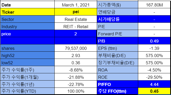 펜실베니아 리얼 에스테이트(PREIT, PEI)는 분기배당을 하는 리츠였지만, 작년 코로나 이후 배당을 삭감하였고, 그후 파산직전에는 배당을 중지하였다.