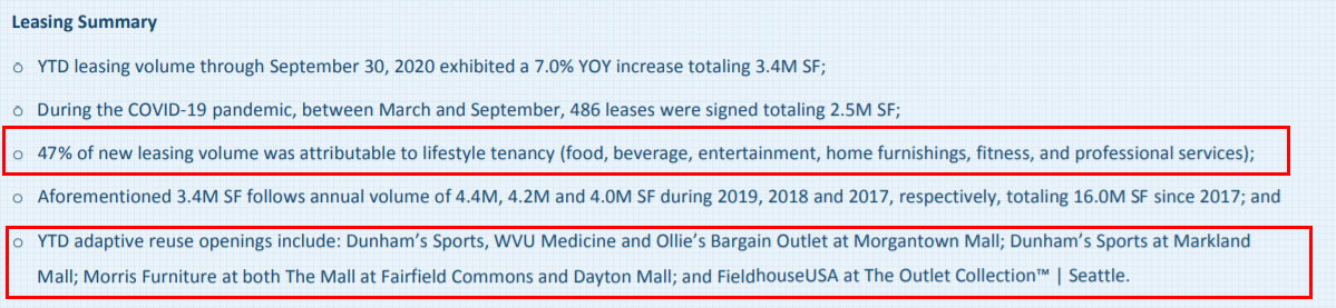 워싱턴프라임그룹(WPG)가 2020년 REIT World Conference에서 발표한 자료에 따르면, 2020년 9월 30일 기준으로 47%의 신규 임차인이 Lifestyle Tenancy였다고 말한다. 최근 트렌드처럼, 대부분의 쇼핑몰, 아울렛 신규 Leasing은 물건을 판매하는 임차인보다, 서비스를 판매하는 임차인 위주로 편성되고 있다. 이는 쇼핑몰, 아울렛 등이 경험의 공간으로 변모해가고 있다는 것을 뜻한다.