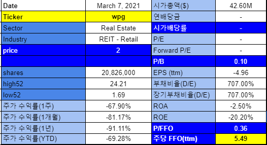 미국 리츠 시장(2021.02.16) - 워싱턴프라임그룹(WPG) 급락 사태