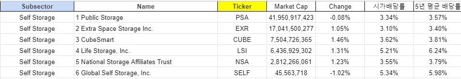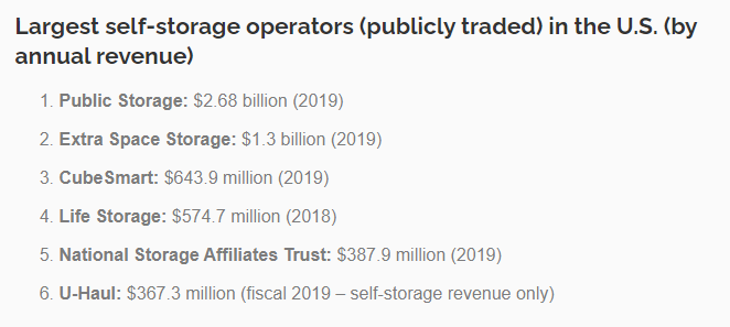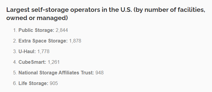 셀프스토리지의 메인 5개 리츠는 퍼블릭 스토리지(PSA), 엑스트라 스페이스 스토리지(EXR), 큐브스마트(CUBE), 라이프 스토리지(LSI), 내셔널 스토리지(NSA)이다. 미국의 셀프스토리지 시장은 굉장히 파편화되어있는 편이지만, 그래도 Majority는 바로 퍼블릭 리츠 등이 브랜드 파워로 밀고 나가고 있는 형상이다.