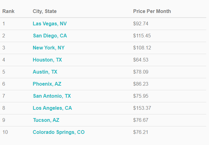 이건 가장 기본인 10x10 수준 셀프스토리지 가격이다. 10x10은 대략 3평정도되는 공간이다. 역시 뉴욕, 샌디에고, LA 등 대도시의 셀프스토리지 수요가 높은 편이다. 자연히 이런 대도시는 인구당 사용공간이 좁기 때문에 셀프스토리지 수요가 높을 수 밖에 없다