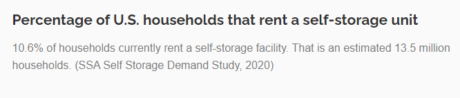 아까 말했듯이 미국 10가구 중 1가구는 셀프 스토리지를 사용하고 있는데, 이는 약 천삼백만 가구에 해당하는 수준이다. 놀라운 수준이다.