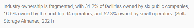 아까 말했듯이 셀프스토리지 섹터(산업)은 굉장히 파편화되어 있어서 약 6개의 셀프스토리지 리츠가 49,000개 가량의 셀프스토리지 중 약 30%를 소유하고 있고, 16.5%는 다른 오퍼레이터들, 그리고 대망의 나머지 52.3% 가량을 작은 영세업자가 가지고 있다.