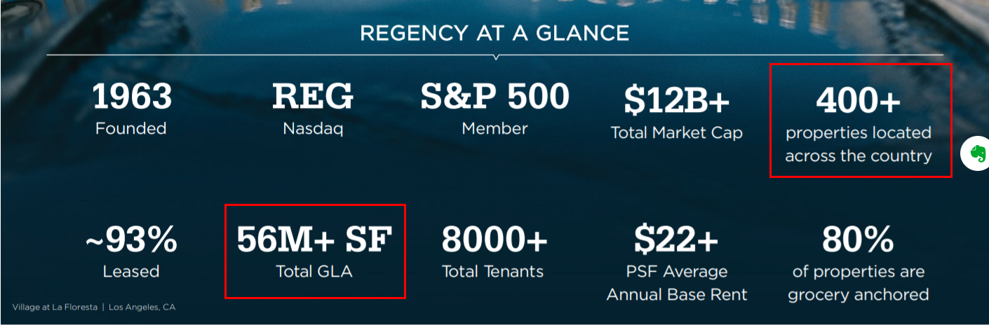 리젠시센터(Regency Center, REG)은 이런 쇼핑센터 부지를 약 400개 가량(약 56mn sqft) 소유하며 운영하는 리츠이다. S&P500에 해당하기도 하며 시총 $12bn에 이를정도로 규모가 큰 리츠이다.