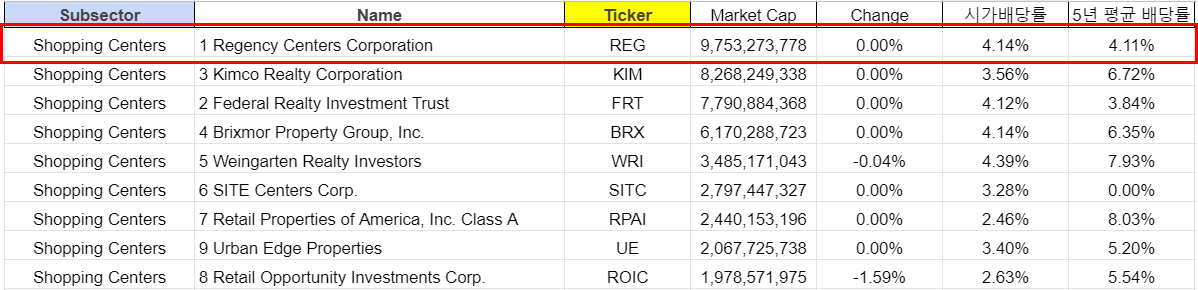 1. 리젠시센터(REG)는 미국 쇼핑센터 대장주로 시총 $12bn 규모이다