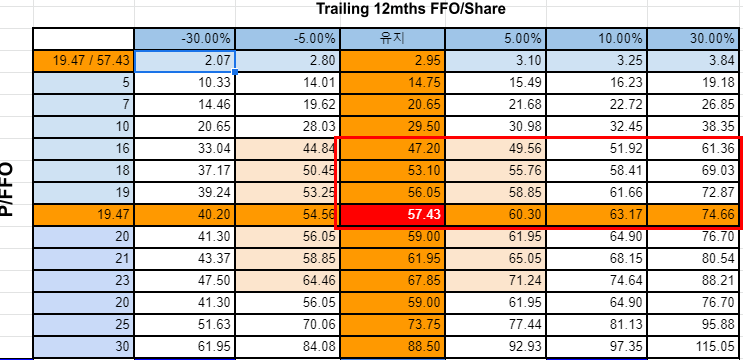 4. 현재 리젠시센터(REG)의 P/FFO 19.5x 수준은 고평가로 보여진다. 다만 $50 아래서는 안전마진이 존재하는 것으로 보여진다.