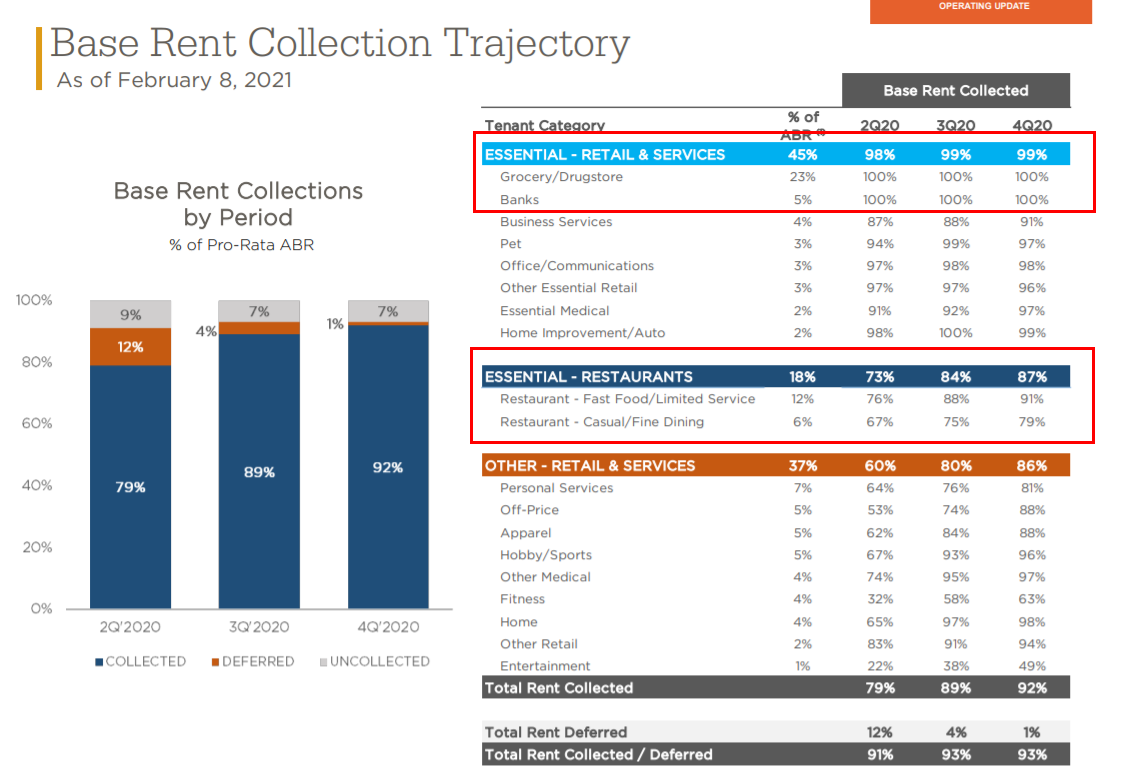 리젠시 센터(REG)는 쇼핑센터, 커뮤니티 센터 등에 Grocery 등을 판매하는 마트, 약국, 은행 등 다양한 Essential 서비스를 보유하고 있으며 그외에도 미용실, 헬스장, 옷집, 레스토랑 등을 임차인으로 보유하고 있다. 흥미로운 점은 Grocery, Drug store, 은행 등의 임대료 회수율은 거의 100%였던 반면에 레스토랑, 음식점, 헬스장, 기타 리테일의 임대료 회수율은 굉장히 낮은 수준이었다는 것이다.