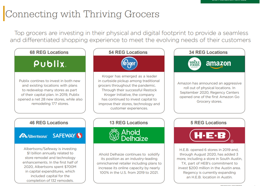 2. 리젠시센터(REG)는 식료품점(마트)를 앵커로 하는 커뮤니티 쇼핑센터를 주로 소유/운영하는 리츠이다.