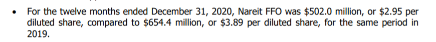 리젠시센터(REG)는 2019년 $3.89의 주당 FFO에서 2020년 $2.95로 약 20% 하락하였다.