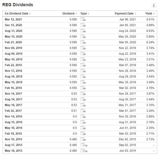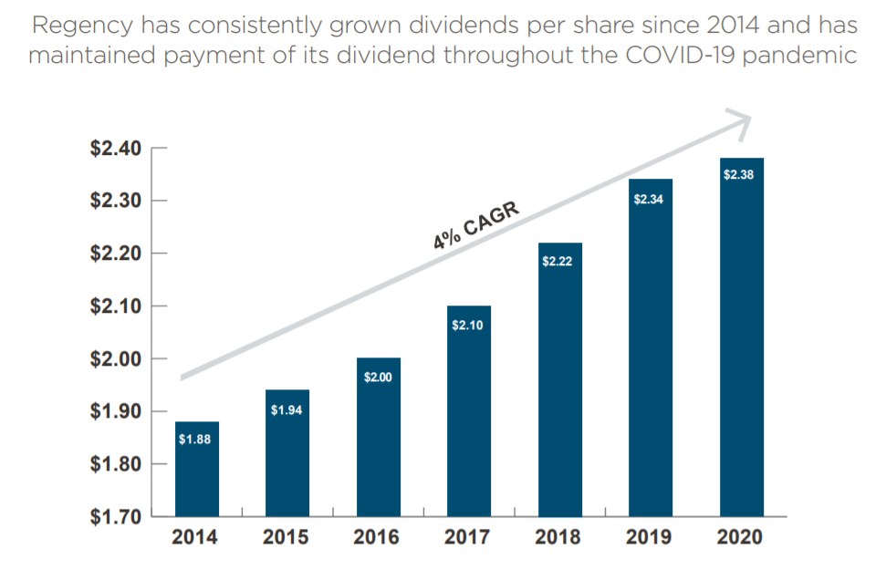 리젠시 센터(REG)은 분기배당 리츠이며, 코로나19 당시에도 배당컷 없이 오히려 배당을 증액한 튼튼한 리츠이다. 5년 평균 배당률은 4.1% 수준이다.