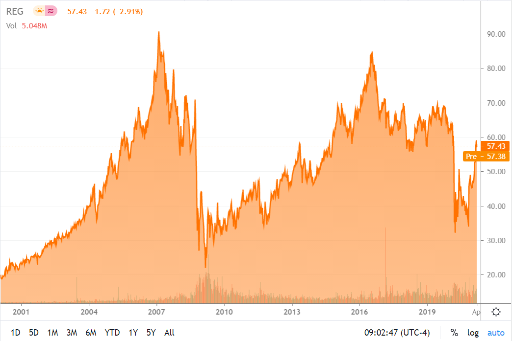 쇼핑센터 리츠 대장주인 리젠시센터(Regency Center, REG)는 코로나19 이전 대폭락 이후 현재 코로나 이전 수준의 주가로 대부분 회복되었다. 이는 특히 경제 개방 이후, 기타 다른 쇼핑몰 리츠보다 더 접근성 및 필수성이 클 수 밖에 없는 쇼핑센터 리츠상 가능한 일이었다.