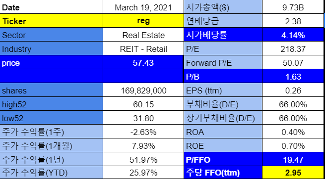 1. 리젠시센터(REG)는 미국 쇼핑센터 대장주로 시총 $12bn 규모이다
