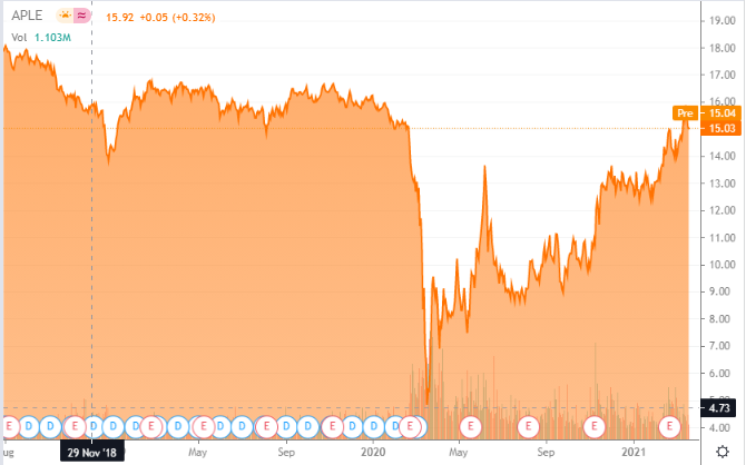 - 애플 호스피탈리티(APLE)은 코로나19 이전 $16~17 주가 수준이었지만, 현재 코로나19가 해결되지 않은 상황에서도 이미 $15 수준으로 주가가 회복되었음. 이는 배당금 수준과 비교해보았을 때 고평가 수준이라고 볼 수 있음