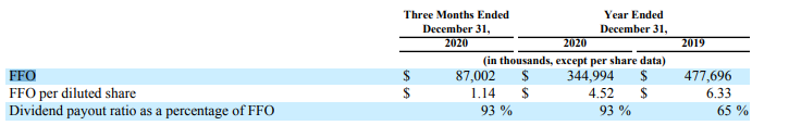 올해 주당 FFO는 약 30% 감소하였다. FFO 대비 배당금 비율은 이로 인해 2019년 65% 수준에서 93% 수준으로 증가하였다. 다만 배당금 상승 기록을 지켜낸 것만으로도 선방했다고 본다