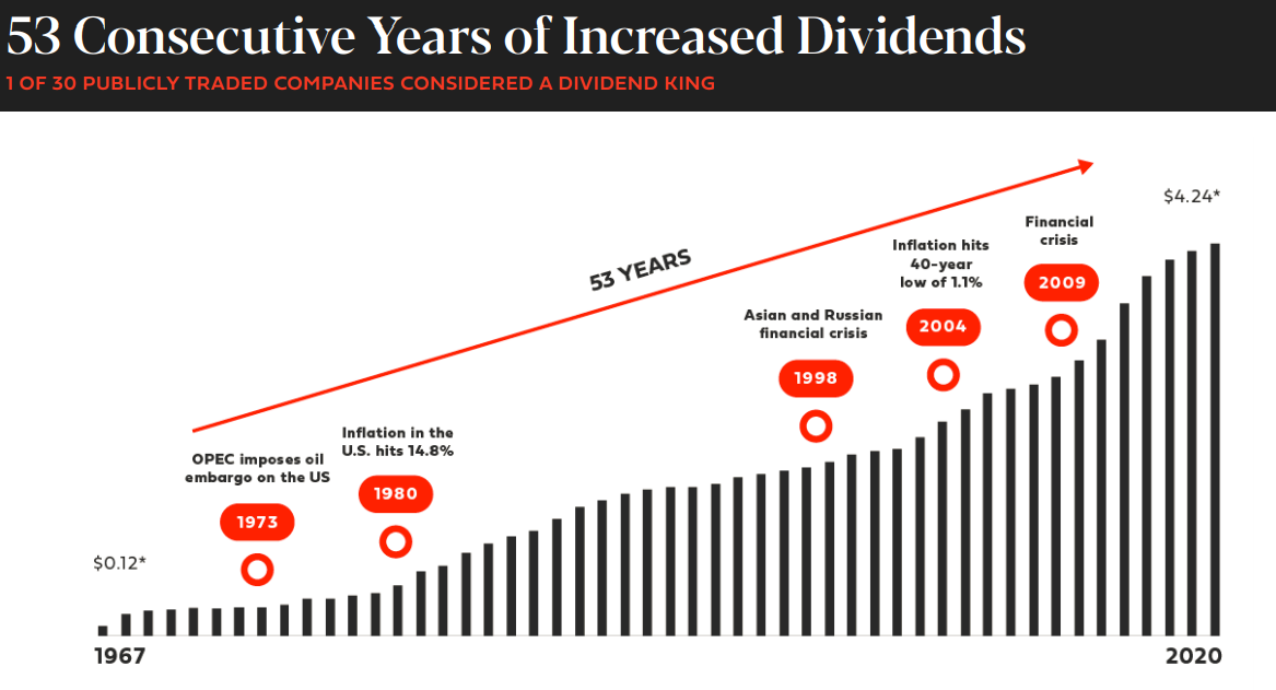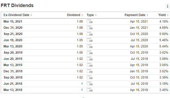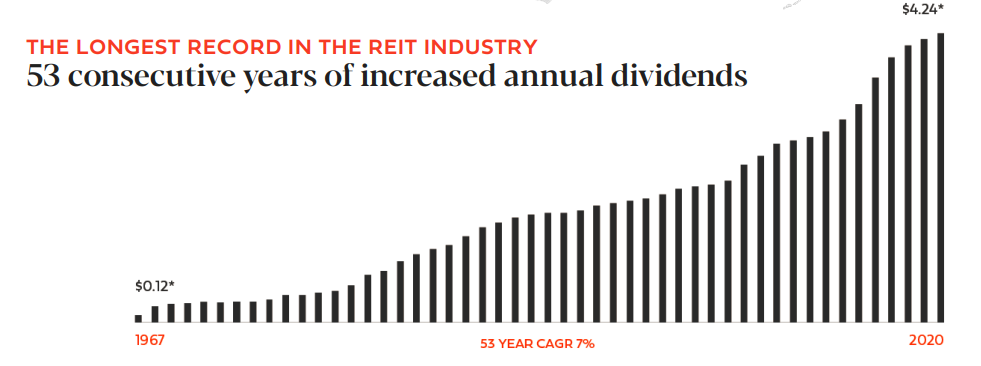 추가적으로 페더럴 리얼티(FRT)는 코로나 중에도 꾸준히 배당금을 인상하며, 53년 연속 배당 인상을 기록 중에 있다