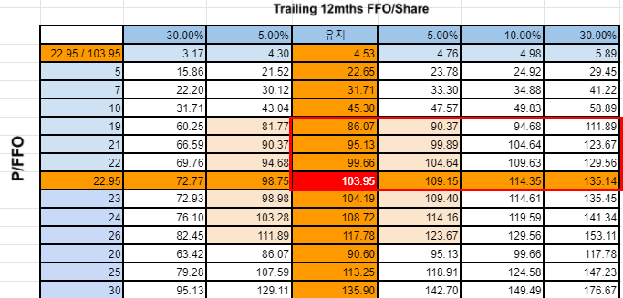 3. P/FFO 멀티플 18~20x 가정 시 약 $120 수준의 주가가 기대된다