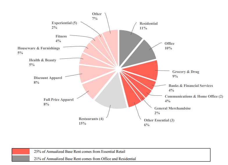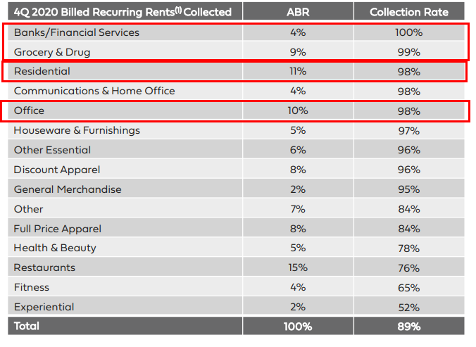 Full Price Apparel, 레스토랑 등 일반적인 영세 규모 리테일을 제외한 리테일은 임대료 회수율은 높은 수준으로 복귀하였다. 주목할만한 점은 페더럴 리얼티(FRT)는 위에서 언급한 것과 같이 레지덴셜, 오피스 비중이 높은 리츠라는 것.