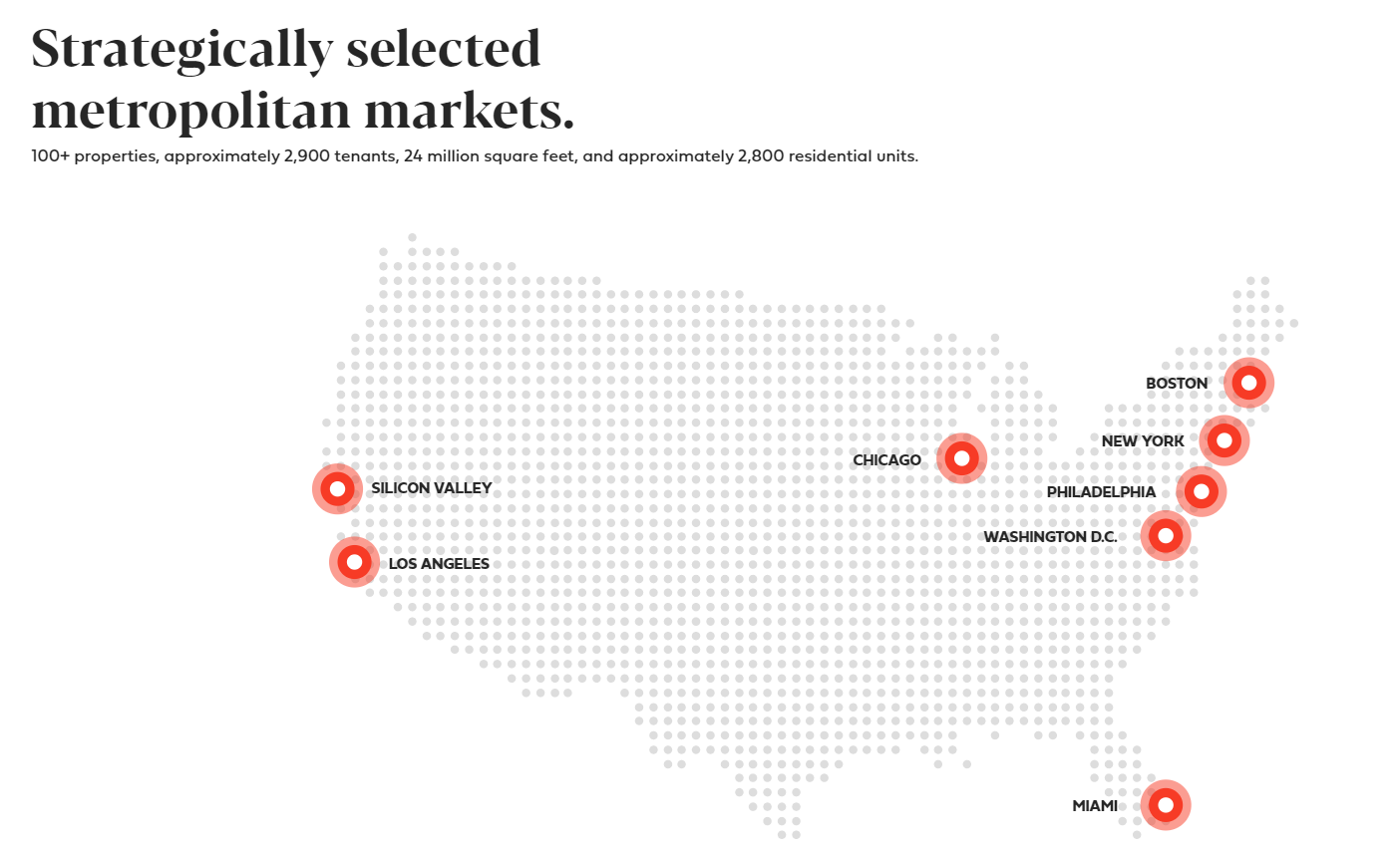 주로 자산은 100여개 약 24mn sqft 수준이며, 오피스 및 2,800 여개의 레지덴셜 Unit 등이다. 주로 Coastal area(서부, 동부 해안) 주요 도시의 교외 지역에 위치하고 있다