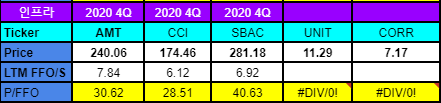 - 대표적인 인프라 리츠는 아메리칸타워(AMT), 크라운캐슬(CCI), SBA커뮤니케이션(SBAC) 및 유니티 그룹(UNIT), CorEnergy 인프라(CORR) 등이 있는데, 주로 앞에 세개는 셀타워 등, 유니티는 Fiber를 다루는 통신인프라 리츠로 5G의 수혜가 기대된다 (CORR는 오일 미드스트림이다.)