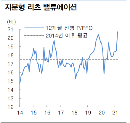 - 전체적으로 리츠 시장에 대한 현재 견해는 고평가 상태로, 12개월 선행 P/FFO는 코로나 이전 2019년말 수준을 넘어섰다. 이는 코로나로 인한 실적 감소에 따른 왜곡으로도 볼수 있지만, 아직 실적이 주가 수준을 따라오지 못하고 있음을 의미하기도 한다.