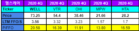 - 다각화가 잘된 웰타워(WELL)에 비해 오메가 헬스케어(OHI), 벤타스(VTR)은 공격적인 포트폴리오(시니어하우징 외 SCN 등)를 가진 헬스케어 리츠 등은낮은 수준의 P/FFO 멀티플. 하지만 헬스케어 리츠 섹터 전체적으로 코로나19 이전에 비해 약 10~15% 상승여력 남아 있는 상태이다.