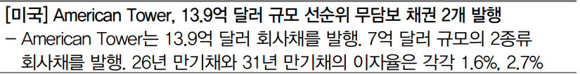 -각각 헬스케어, 인프라 리츠의 대장주인 웰타워(WELL)과 아메리칸타워(AMT)가 낮은 금리로 채권을 발행하였다. 특히 웰타워는 리파이낸싱(차환) 자금으로 이자비용 감소에 큰 폭 기여할 것으로 예상된다.