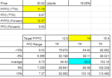 좀 공격적으로 P/FFO를 14 수준으로 보면 90달러 중반 수준으로 예측된다. 여기에 사용된 FFO는 지난 12개월과 향후 예측치의 평균치이므로 보수적인 가정치이다.