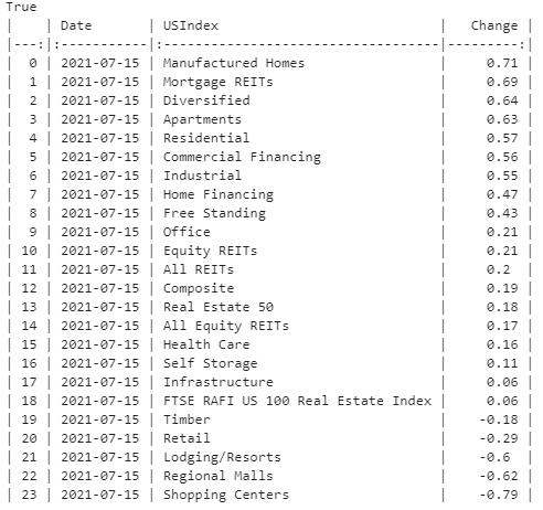 - 2021년 7월 15일 미국 리츠 시장은 전체적으로 무난한 상승세. 다만 코로나19에 의해 영향 받는 리테일, 호텔, 쇼핑몰, 쇼핑센터 등의 리츠는 어느정도 쉬어가는 모습을 보였다.