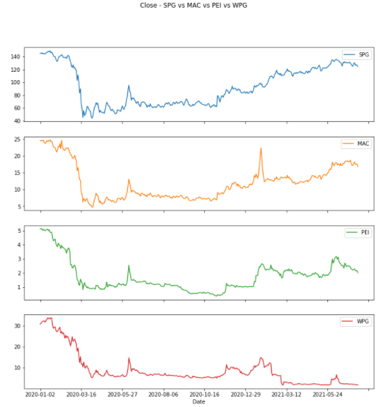 이 네개의 리츠 사이먼프로퍼티스(SPG), 메이서리치(MAC), 펜실베니아 리얼 이스테이트(PEI), 워싱턴프라임(WPG)의 2020년 1월부터 현재까지의 과거 주가는 감탄스러울 지경이다.
