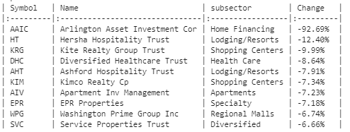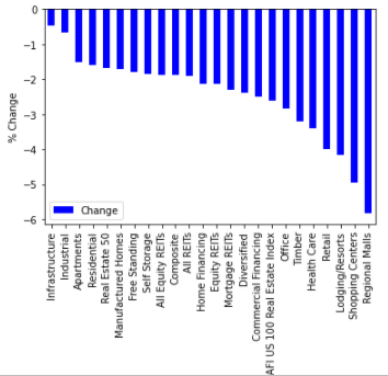 - 허샤 호스피탈리티(Hersha Hospitality, HT), 카이트 리얼티 그룹(Kite Realty Group, KRG) 등 약 10% 하락