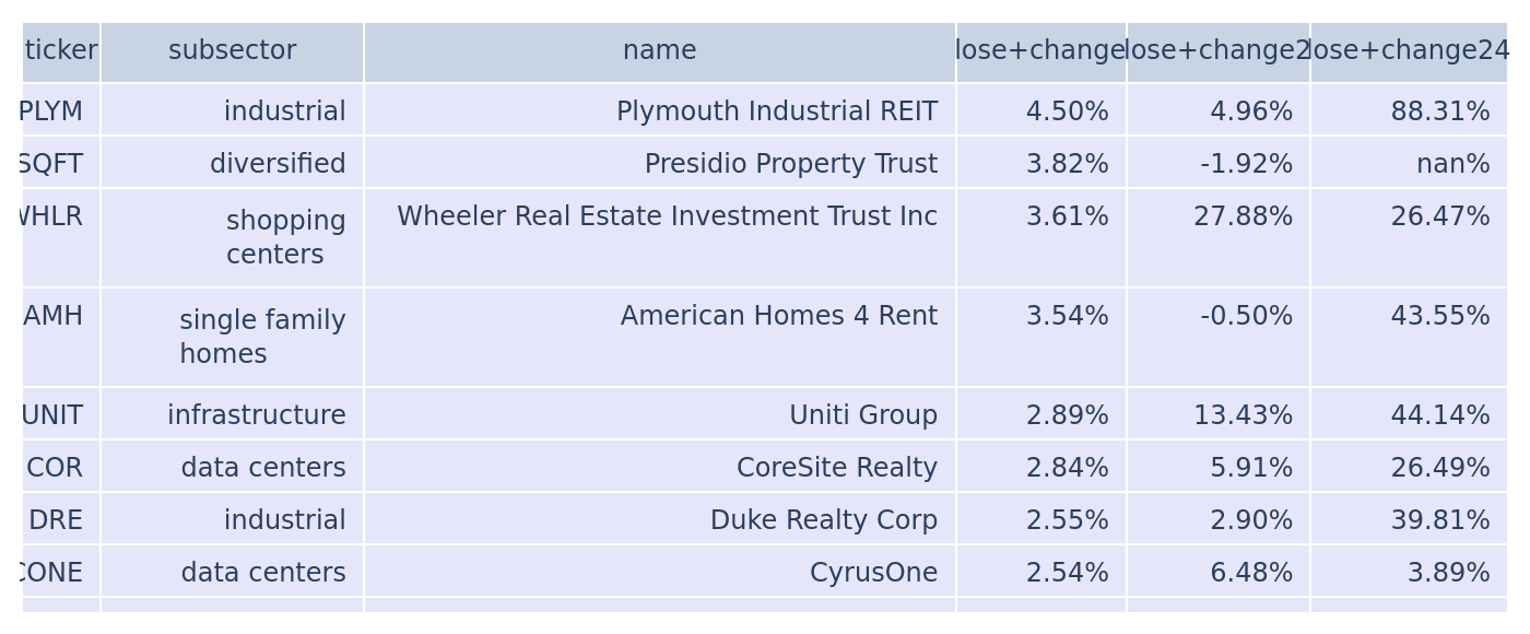 - 윌러 리얼 에스테이트(WHLR)을 제외한 Top Gainer는 지난주 보합세였던 인더스트리얼, 데이터센터, 인프라 등 섹터의 리츠 등이 대거 포진. 높은 상승세보다는 전체적으로 2%~3% 반등세 유입