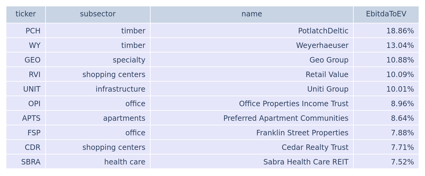 *Ebitda to EV는 EV - EBITDA 비율의 역수로 부동산에서 사용되는 지표인 Cap Rate (총자산가격/NOI)에 대체재로 사용하였음. 하지만 해당 지표는 리츠가 부동산 자산이 아닌 기타 이익(Thrid Party 관리 비용 등, 호텔 직접 영업비용) 등으로 수익을 높게 올릴 시 왜곡될 수 있음