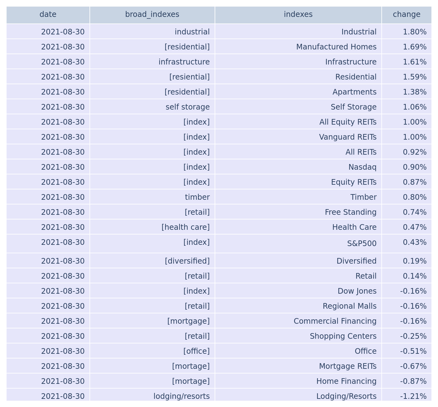 | 최근 1개월 섹터별 미국 리츠 수익률 비교 - ARE(알렉산더 리얼티), COLD(아메리콜드) 등 (0) | 2021.08.27 |