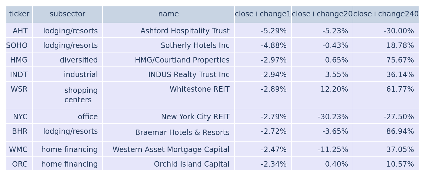 - 지난주 높은 상승률 보였던 애쉬포드 호스피탈리티 등의 호텔 리츠 등 강한 하락세