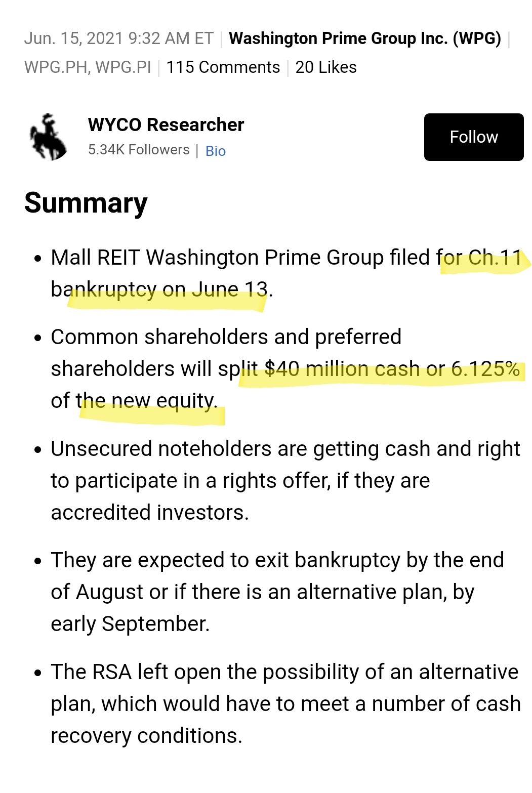 최근 워싱턴프라임(WPG)은 2021년 6월 14일 개장과 함께 주가 절반이 날아가버렸다. 최근 pending 중이었던 Chapter 11 관련 이슈의 첫번째 향방이 결정되면서였다. https://dbs0415.tistory.com/121?category=92..