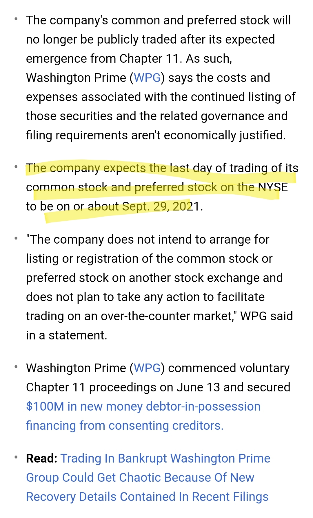 최근 9월 기사에 따르면 모든 절차는 대부분 마무리되었으며 워싱턴프라임(WPG)는 9월말 거래 중단 예정.