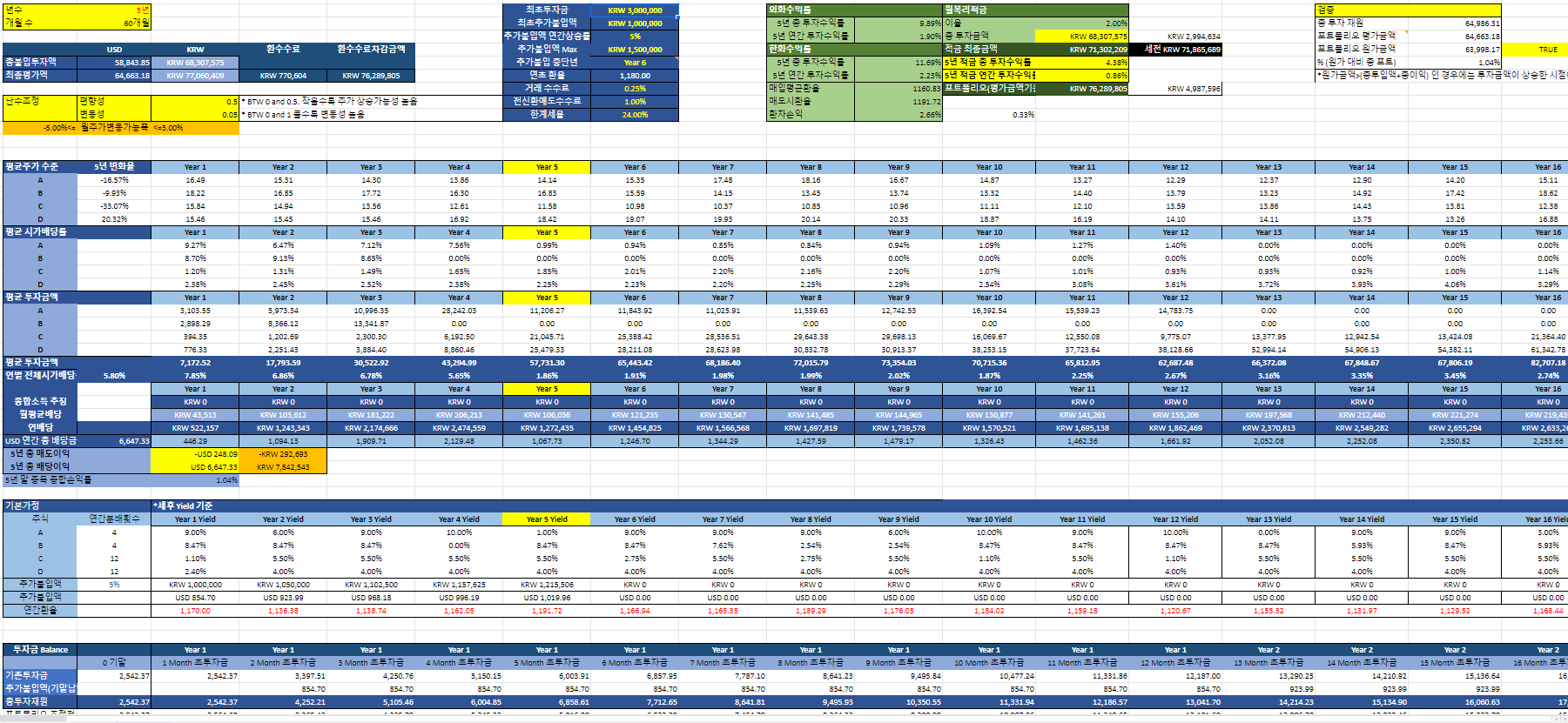 참고로 위에 첨부한 모델에는 배당에 대한 Random Variable은 삽입되어있지 않다. 해당 리츠가 안정적이라는 기준으로 다음년의 배당액은 전년도 마지막월 주가 대비 평균 시가배당률을 기준으로 매년초 다시 셋팅되는 것으로 잡혀있다.