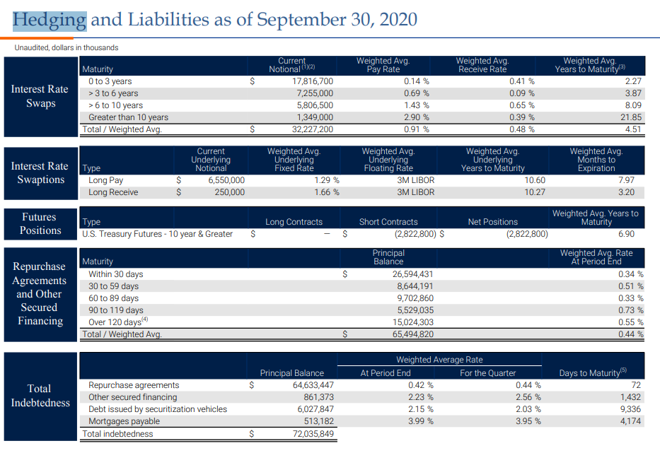 Annaly Capital Management(NLY; 애널리 캐피탈 매니지먼트)의 위의 사례를 보듯이, NLY는 차입금(Borrowing)에 대하여 Interest Rate Swap, Interest Rate Swaptions, Future Short 등을 이용하여 헷징을 하는 것을 알 수 있다.