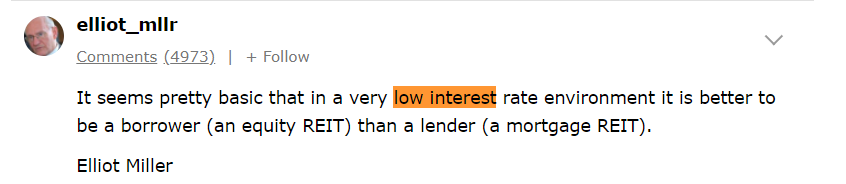 - 모기지 리츠는 일반적으로 낮은 금리환경이 우호적이다. 그 이유는 더 싸게 많은 차입을 일으켜서 Leverage를 사용하여 많은 돈을 벌 수 있기 때문이다.