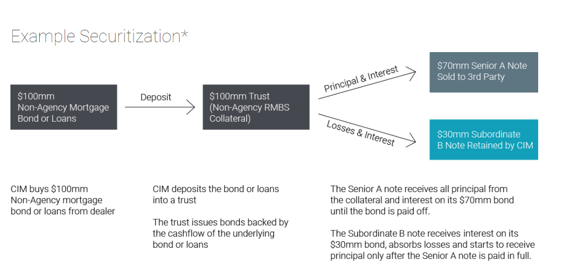 주목할 점은 키메라 인베스트먼트는 Residential Loan(주거용 대출)을 직접 딜러로부터 매입해서 Securitization(증권화)하는 방법으로 A-note를 Third party 판매하고, B-note를 보유한다는 점이다. 통상적으로 A-note는 이율이 낮은 반면에 담보에서 우선순위를 가진다. B-note는 담보에서 우선순위를 내주는 대신 이율을 높게 가져간다.