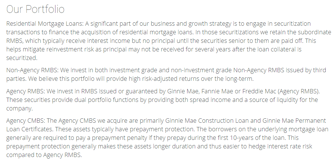시총 5위($2.4bn) 규모의 키메라 인베스트먼트(CIM, Chimera Investment)은 크게 (1) Residential Loan(주거용 대출), (2)Non-Agency RMBS(주택담보대출증권), (3)Agency RMBS(주택담보대출증권), (4)Agency CMBS(상업용부동산담보대출증권)으로 구성되어 있다.
