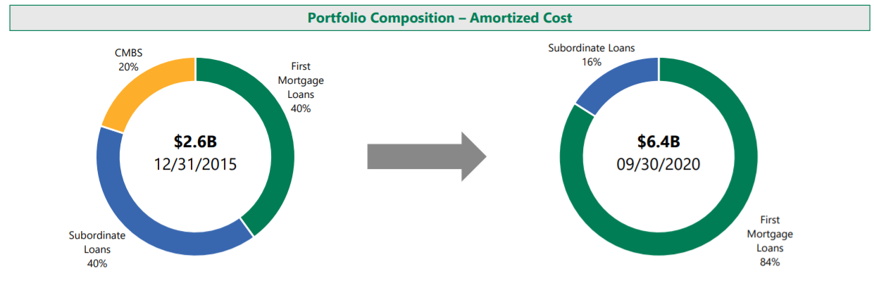 아폴로 리얼 이스테이트 파이낸스(ARI)는 최근에 포트폴리오 변동이 있었다. 기존 First Mortgage Loan(선순위대출), Subordinate Loans(후순위대출), CMBS(상업용부동산담보대출증권)의 구성에서 대부분 First Mortgage Loan(선순위대출)로의 포트폴리오 변화가 눈에 띈다.