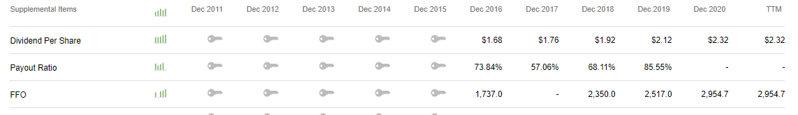 Prologis(PLD)는 FFO 대비 60% 수준의 굉장히 보수적인 수준의 배당률을 지속하고 있는 기업이다. 매년 기존 자산 규모의 상당히 높은 수준을 개발 및 인수에 할애하고 있는 것을 보면 그럴만도 하다. 또한 매년 꾸준히 배당을 올리고 있는 배당성장형 리츠/주식이기 때문에 굉장히 매력적인 주식