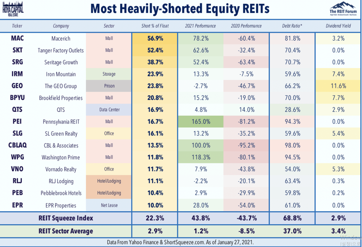 하지만 작년 코로나의 영향으로 인해 리테일, 호텔 섹터 등 많은 리츠 섹터들의 배당이 멈추고, 장기적 유동성이 불안해지면서 공매도(Short) 포지션이 다량으로 유입되는 계기가 됐다. 위에 Hoya Capital에서 공매도 현황을 한 번 보면 단숨에 알 수 있다.