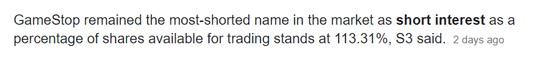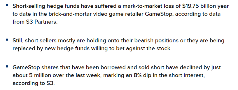 CNBC에 따르면 현재 시가평가액 기준으로, 헤지펀드 등이 공매도 투자자들이 약 USD 19.75bn, 즉 20조원이 넘는 손실을 보고 있지만, 그럼에도 불구하고 게임스탑(GME)의 공매도 비율은 약 8% 밖에 감소하지 않았다. 8%를 감소하고도 아직 유통물량 대비 공매도 물량은 113%에 달한다.