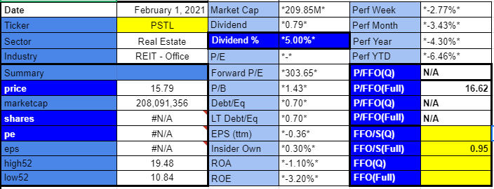 그렇다면, 포스탈 리얼티(PSTL)의 정확한 사업구조와 실적 등을 들여다 보고 이 리츠의 리스크는 무엇일지 한 번 살펴보자