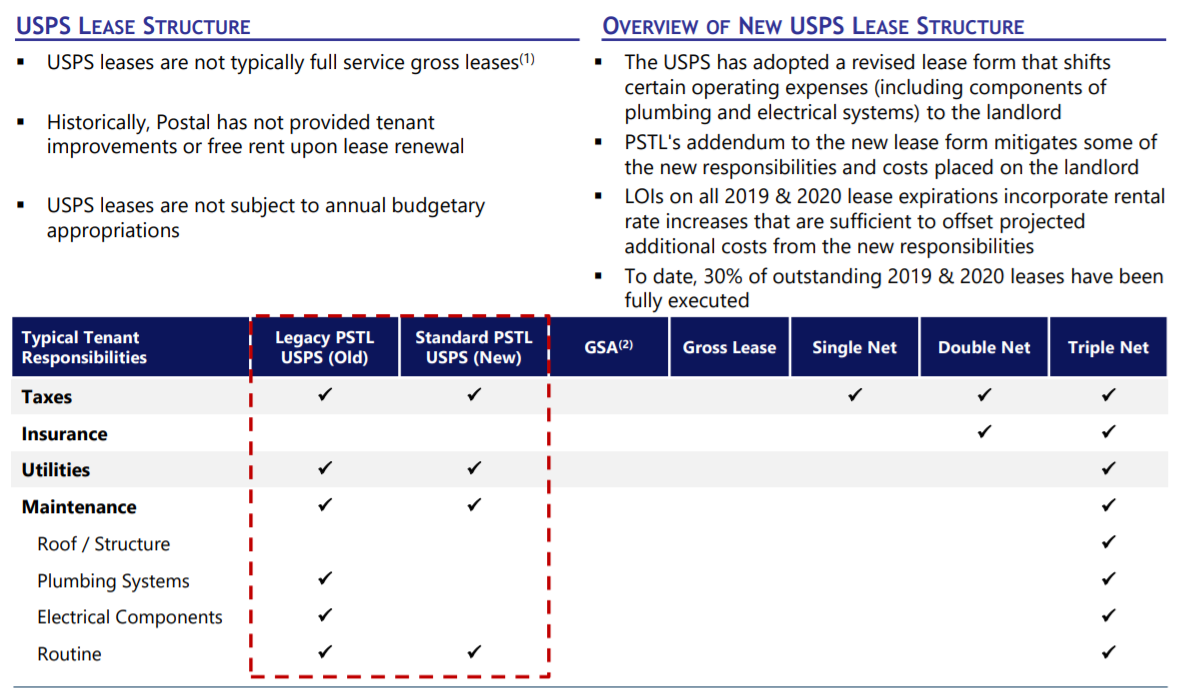 일반적으로 USPS(미국 우체국)과의 임대차계약은 Triple Net(NNN)보다는 아니지만, 상당한 부분을 임차인, 즉 미국 우체국에게 책임을 전가하는 방식의 임대차계약 방식을 택하고 있다. 다만 최근 USPS와의 갱신된 Form을 통해서 USPS(미국우체국)은 Landlord에게 조금 더 많은 책임을 지는 Form으로 변경된 것으로 보인다.