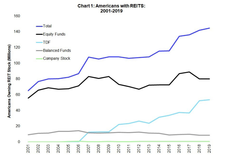 해당 리서치에 따르면, 2001년부터 2019년까지 REIT 주식을 보유한 미국 국민이 65백만에서 145백만으로 두 배 이상 증가한 것을 알 수 있다
