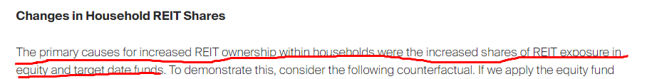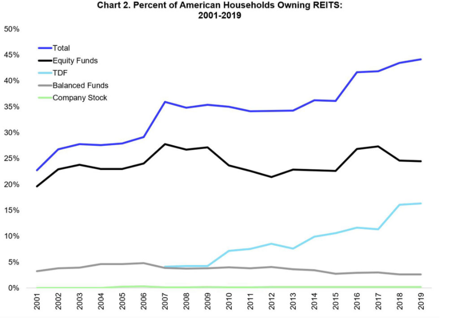 기본적으로 약 20년간 이토록 미국 국민의 미국 리츠 소유 비율이 높아진 이유는 펀드와 TDF펀드의 영향인 것으로 보인다. 즉, 수많은 펀드들이 미국 리츠를 구성 주식 중의 하나로 담기 시작했다는 것이다.